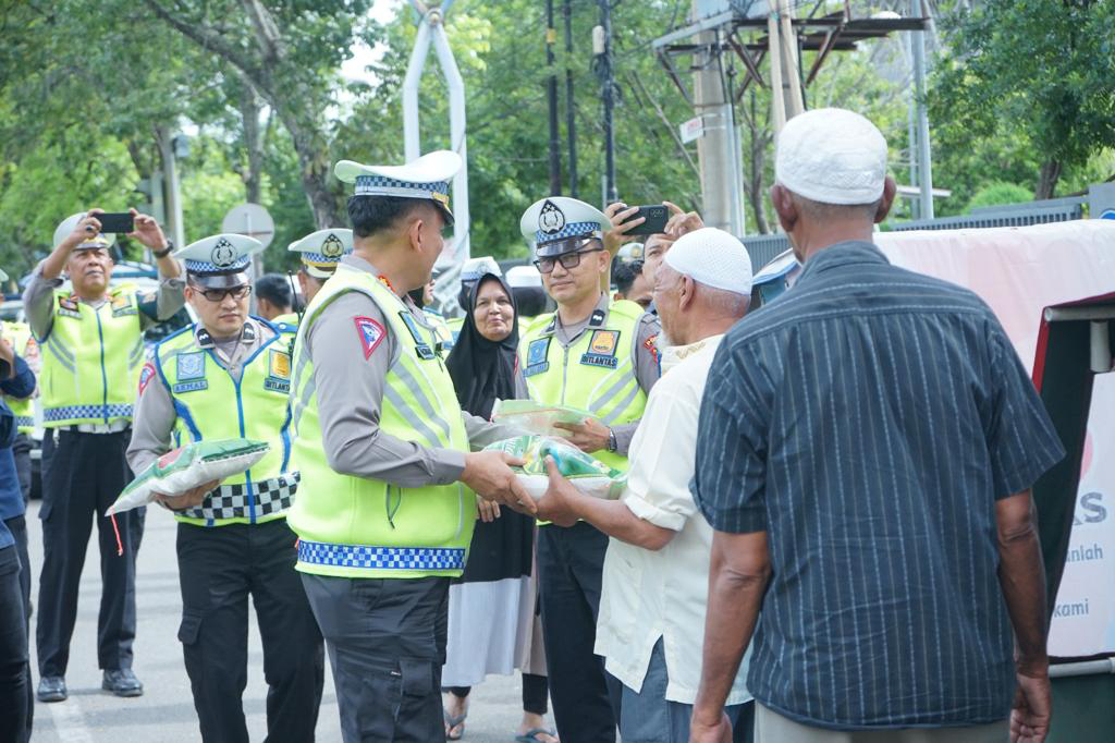Banda Aceh — Direktorat Lalu Lintas (Ditlantas) Polda Aceh kembali melaksanakan kegiatan Jumat Berkah dengan membagikan makanan dan sembako, Jumat, 29 Desember 2023.